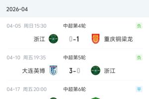 体育资讯04月25日讯 本赛季进入4月以来,浙江队连续5场中超比赛1平4负,且一球未进,净丢10球。